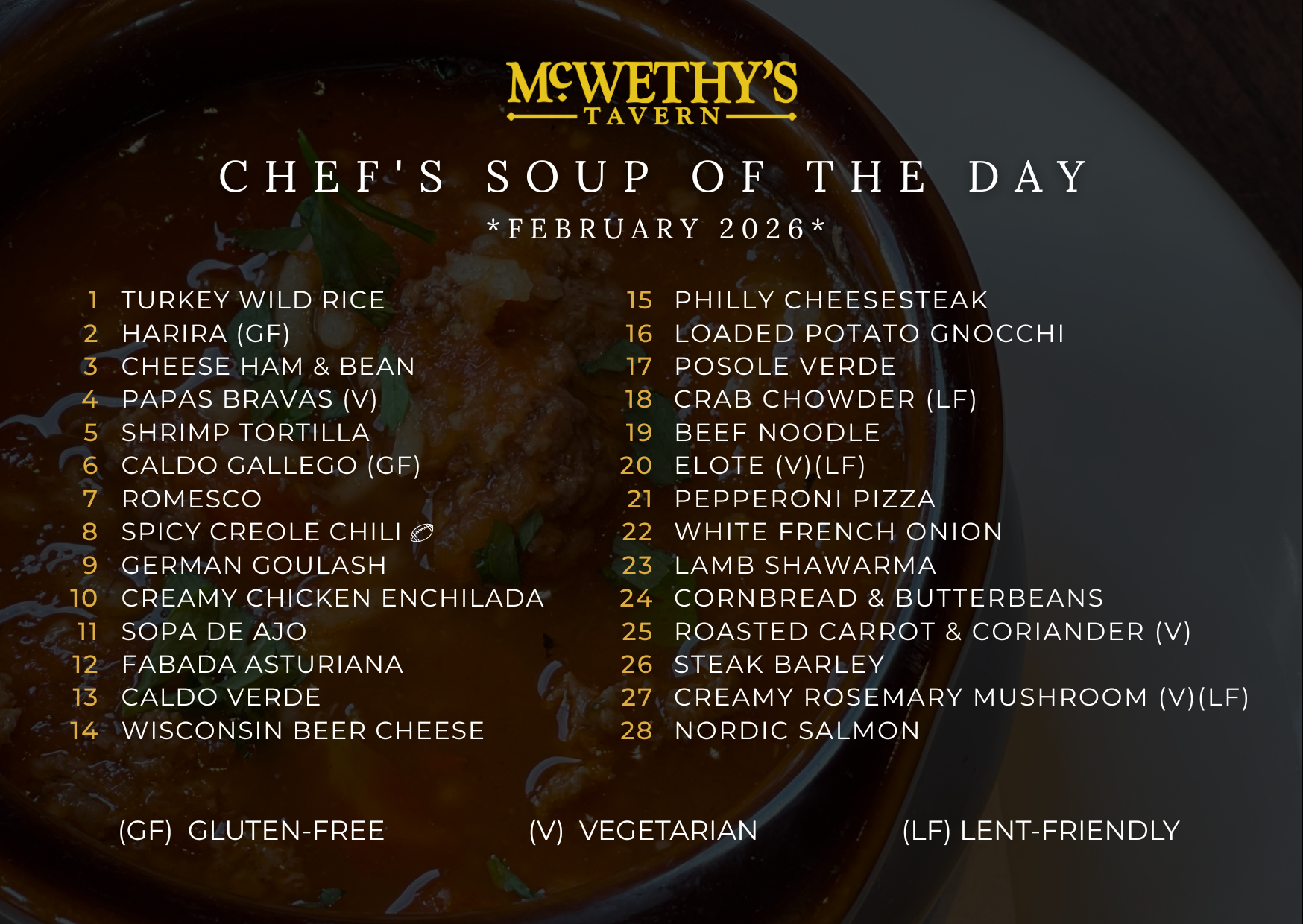 When you join the McWethy's Tavern monthly SOUPscription, you'll receive four (4) 32oz containers of Chef-made soup per month.